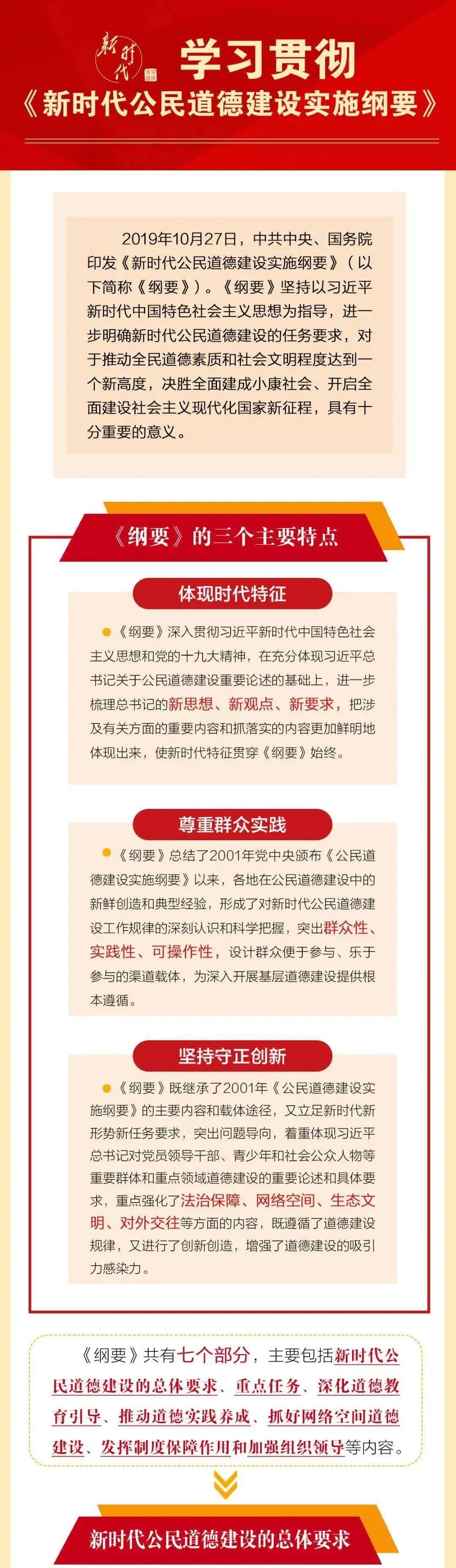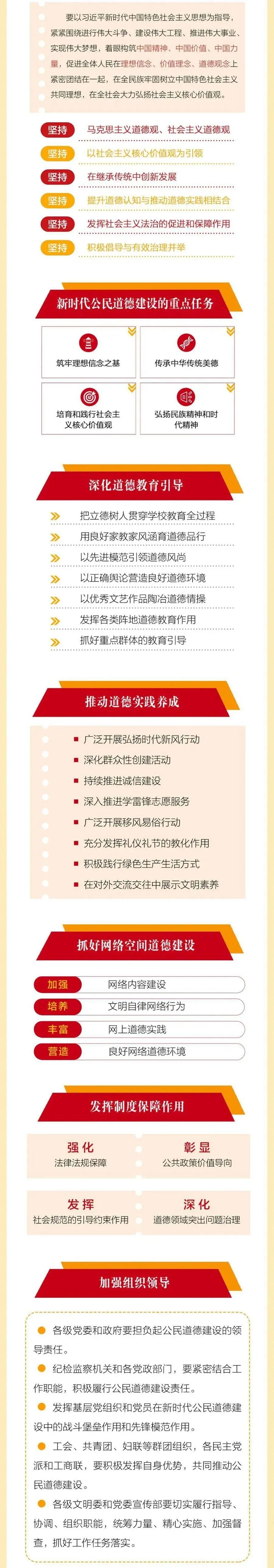 对新时代公民道德建设提出了总体要求和重点任务,并对深化道德教育引导、推动道德实践养成、抓好网络空间道德建设、发挥制度保障作用等方面的工作作了具体安排。