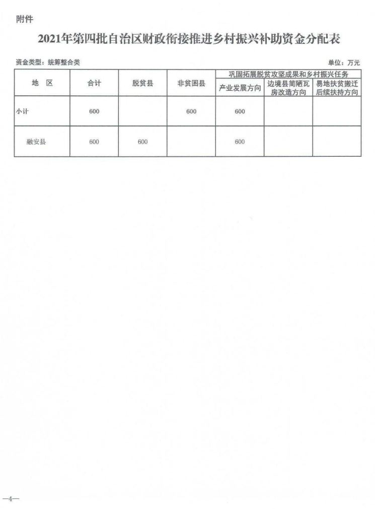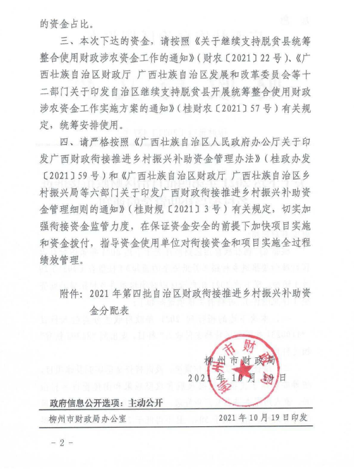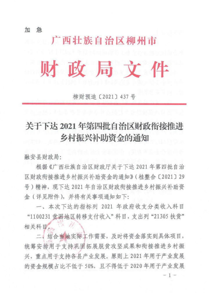 柳财预追〔2021〕437号 关于下达2021年第四批自治区财政衔接推进乡村振兴补助资金的通知