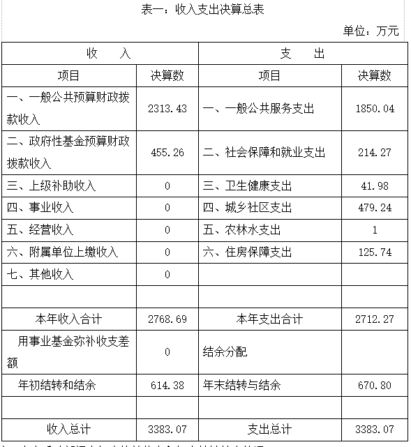 本部门2019年度财政拨款收、支总决算3383.07万元、3383.07万元。与2018年相比,财政拨款收、支总计各减少551.15万元,下降14.01%。