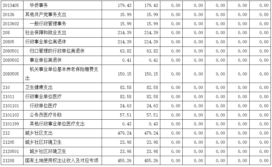 5.一般公共服务(类)统战事务(款)华侨事务(项)。年初预算为179.43万元,支出决算为188.43万元,完成年初预算的105.02%。决算数大于预算数的主要原因是侨胞之家等项目支出大于预期,部分支出按规定通过使用以前年度财政拨款结转资金解决。