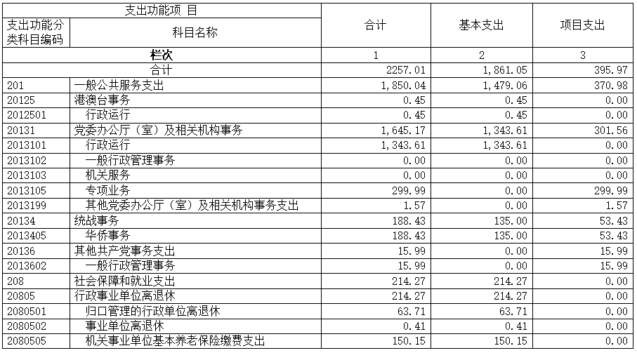 2019年度财政拨款支出2257.01万元,主要用于以下方面:一般公共服务(类)支出1850.04万元,占81.97%;社会保障和就业(类)支出214.27万元,占9.49%;卫生健康(类)支出41.98万元,占1.86%;城乡社区(类)支出23.98万元,占1.06%;农林水(类)支出1万元,占0.04%;住房保障(类)支出125.74万元,占5.57%。