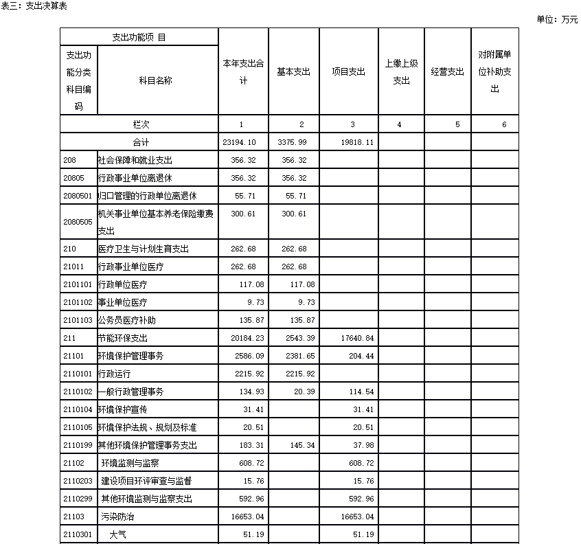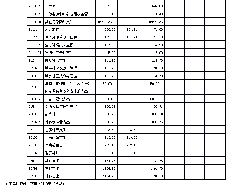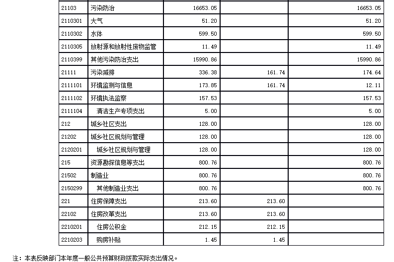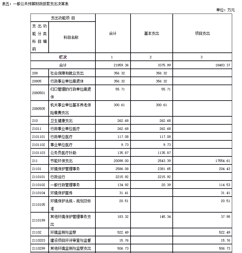 2019年度财政拨款支出21859.36万元,主要用于以下方面:一般公共服务(类)支出0万元,占0%;教育(类)支出0万元,占0%;科学技术(类)支出0万元,占0%;文化体育与传媒(类)支出0万元,占0%;社会保障和就业(类)支出356.32万元,占1.63%;卫生健康支出(类)支出262.68万元,占1.20%;节能环保支出(类)20098.00万元,占91.94 %;城乡社区支出(类)128.00.00万元,占0.59%;资源勘探信息等支出(类)800.76万元,占3.66%;住房保障(类)支出213.60万元,占0.98%.