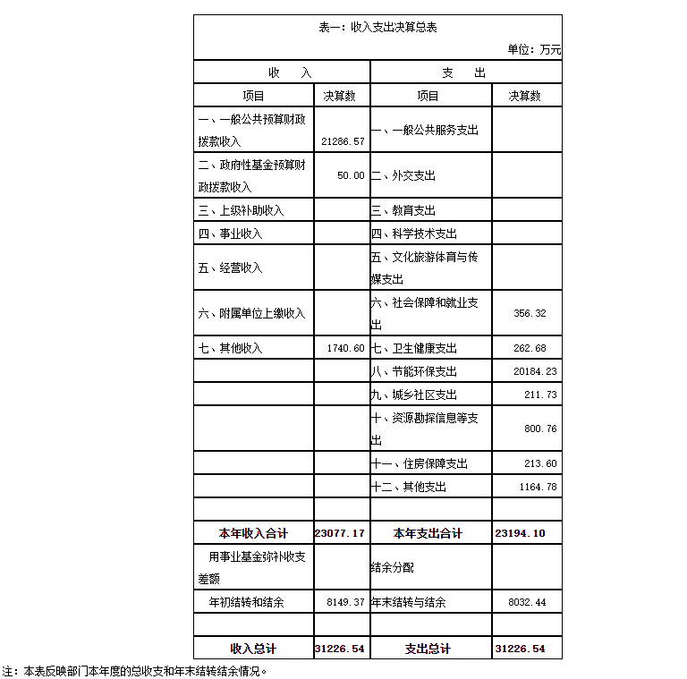 2019年度收入总计31226.53万元,支出总计31226.53万元,与2018年相比,收、支分别增加16500.06万元、16500.06万元;分别增长112.04%、112.04%。