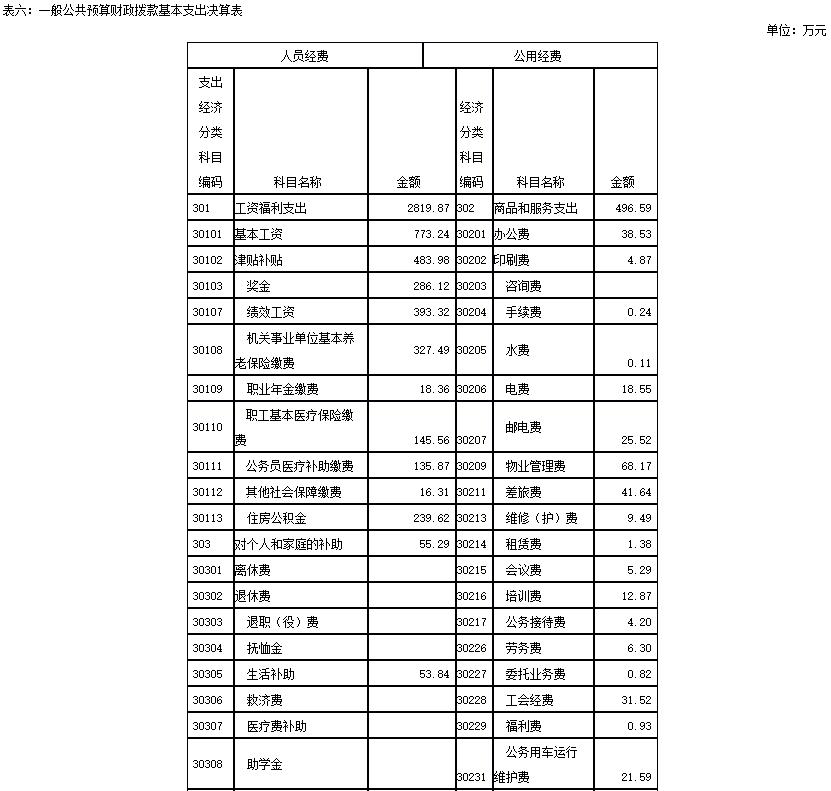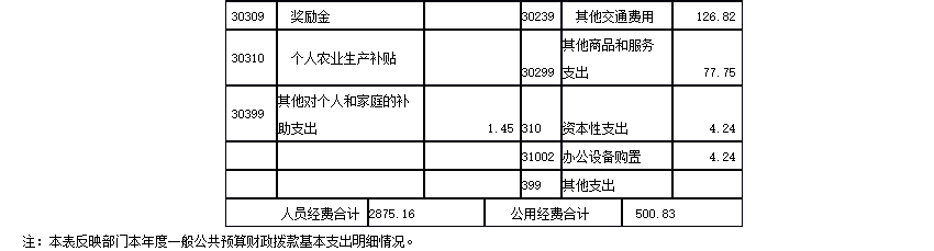 公用经费500.83万元,主要包括:办公费38.53万元、印刷费4.87万元、手续费0.24万元、水费0.11万元、电费18.55万元、邮电费25.52万元、物业管理费68.17万元、差旅费41.64万元、维修(护)费9.49万元、租赁费1.38万元、会议费5.29万元、培训费12.87万元、公务接待费4.20万元、劳务费6.30万元、委托业务费0.82万元、工会经费31.52万元、福利费0.93万元、公务用车运行维护费21.59万元、其他交通费用126.82万元、其他商品和服务支出77.75万元、办公设备购置4.24万元。