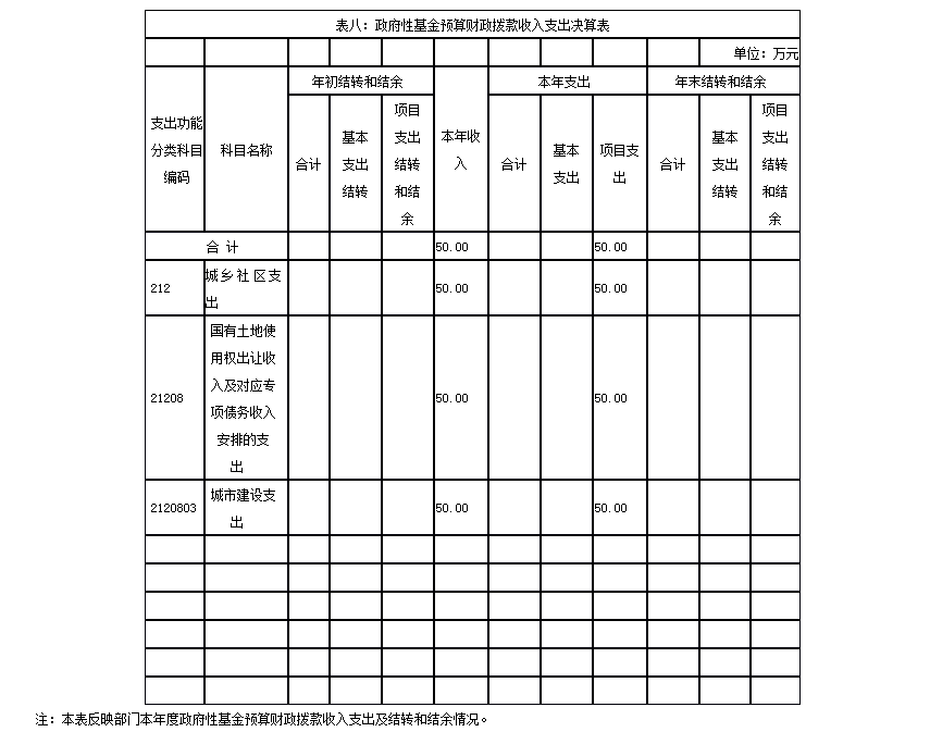 城乡社区支出(类)政府住房基金及对应专项债务收入安排支出(款)城市建设支出(项)。 年初预算为0万元,支出决算为50.00万元,完成年初预算的0%。决算数大于预算数的主要原因是此笔经费是预算追加。