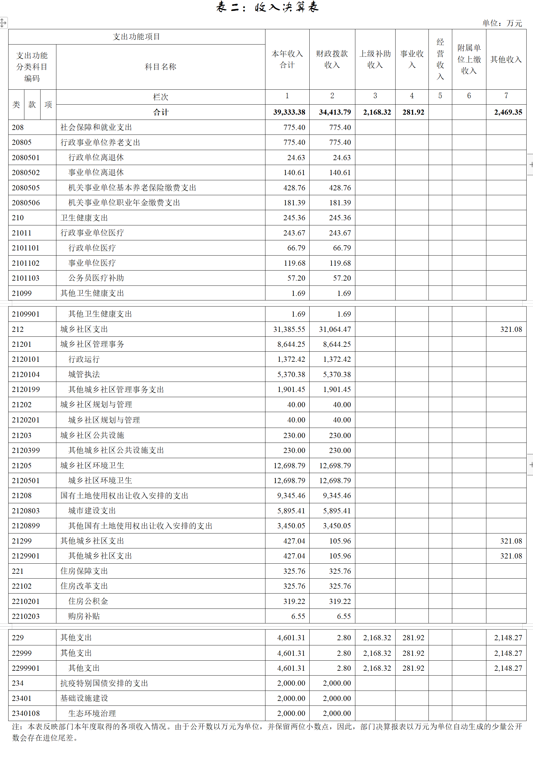 本年收入合计39,333.38万元 ,其中:一般公共预算财政拨款收入23,068.33万元;占58.65%;政府基金预算财政拨款收入11,345.46万元;占28.84%;上级补助收入2,168.32万元,占5.51% ;事业收入281.92万元,占0.72%;其他收入2,469.35万元,占6.28%。