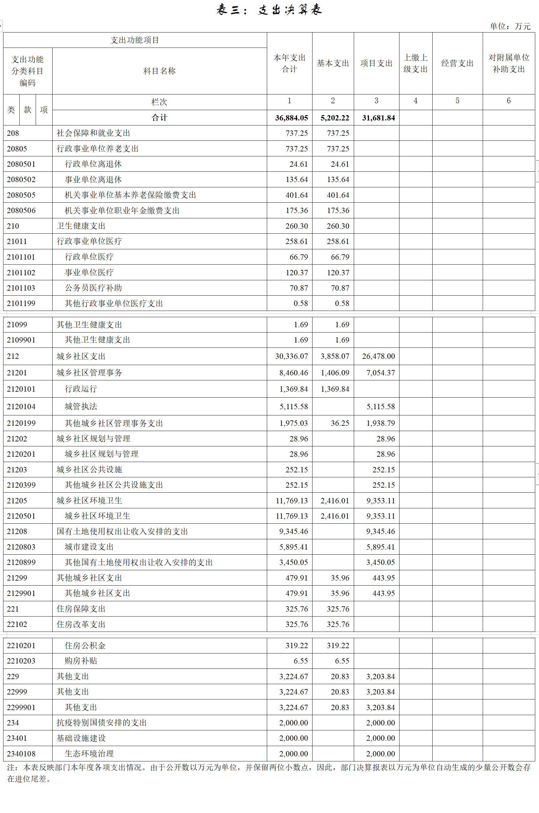 本年支出合计36,884.05万元,其中:基本支出5,202.22万元,占14.1%;项目支出31,681.84万元,占85.9%。