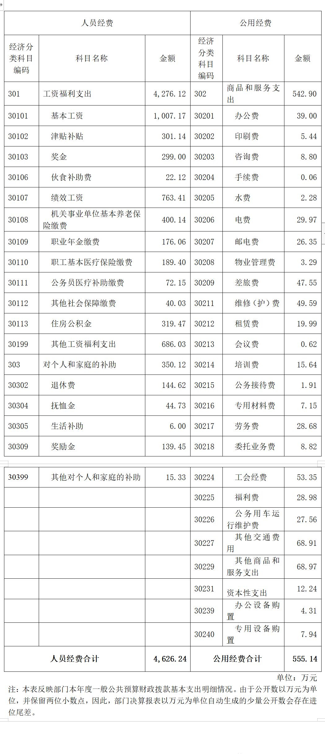 公用经费555.14 万元,主要包括:办公费、印刷费、咨询费、手续费、水费、电费、邮电费、物业管理费、差旅费、维修(护)费、租赁费、会议费、培训费、公务接待费、专用材料费、劳务费、委托业务费、工会经费、福利费、公务用车运行维护费、其他交通费用、其他商品和服务支出、办公设备购置、专用设备购置。
