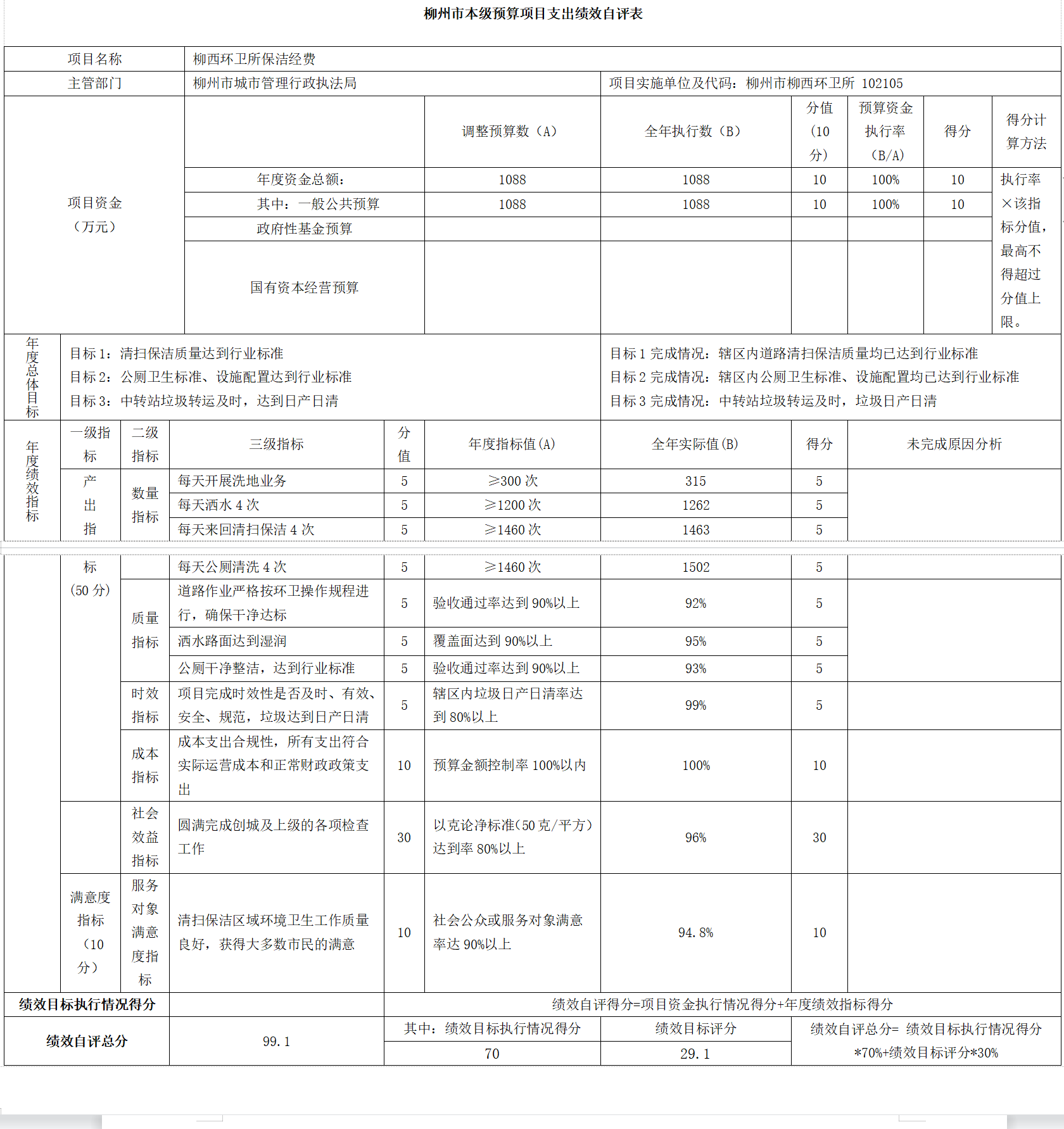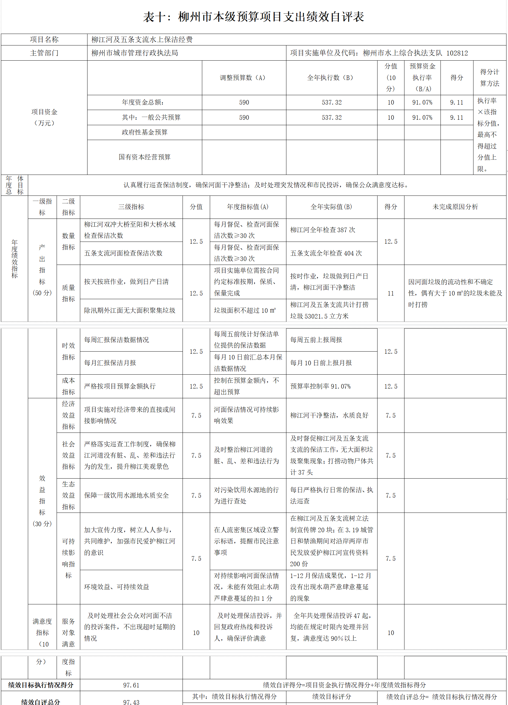 我部门根据年初设定的绩效目标,柳江河及五条支流水上保洁经费项目自评得分为97.43分。发现的主要问题及原因:因河面垃圾的流动性和不确定性,偶有垃圾未能及时打捞。下一步改进措施:加大监督检查力度,发现问题及时处理。柳西环卫所保洁经费项目自评得分为99.1分。发现的主要问题及原因:效益指标编制不够全面。下一步改进措施:细化绩效指标,提高指标设置的科学性、完整性。