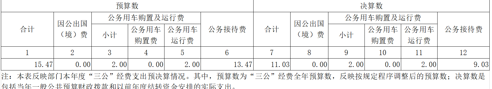2020年度“三公”经费财政拨款支出预算为15.47万元,支出决算为11.03万元,完成预算的71.3%,其中:因公出国(境)费支出决算为0万元,完成预算的100%;公务用车购置及运行费支出决算为2万元,完成预算的100%;公务接待费支出决算为9.03万元,完成预算的67.04%。2020年度“三公”经费支出决算数小于预算数的主要原因是认真贯彻落实中央八项规定精神和厉行节约要求,进一步从严控制“三公”经费开支,全年实际支出比预算有所节约。