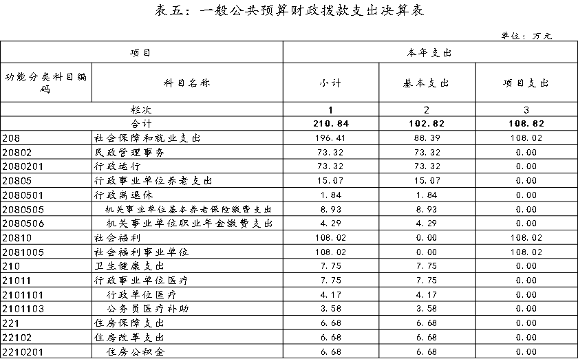 2020 年度财政拨款支出 210.84万元,主要用于以下方面:基本支出一般公共服务(类)支出 102.82万元, 占年度财政拨款总支出48.76%; 其中社会保障和就业类支出88.39万元,占年度财政拨款总支出41.92%;行政运行支出73.32万元;占年度财政拨款总支出34.78%;行政事业单位养老支出15.07万元,其中单位离退休支出1.84万元;单位基本养老保险8.93万元;单位职业年金支出4.29万元;占年度财政拨款总支出7.15% ;单位卫生健康支出7.75万元;其中单位医疗支出4.17万元;公务员医疗补助支出3.58万元;占年度财政拨款总支出3.68%;住房保障(类)支出6.68万元,占年度财政拨款总支出3.17%;项目支出社会福利事业单位支出108.03万元;占年度财政拨款总支出51.24%