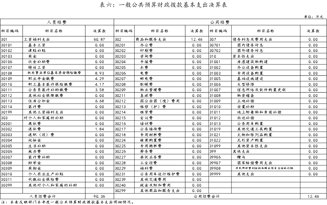 公用经费12.46万元,主要 包括:办公费、印刷费、咨询费、手续费、水费、电费、邮电 费、取暖费、物业管理费、差旅费、因公出国(境)费用、维 修(护)费、租赁费、会议费、培训费、公务接待费、专用材 料费、劳务费、委托业务费、工会经费、福利费、公务用车运行维护费、其他交通费用、税金及附加费用、其他商品和服务支出、办公设备购置、专用设备购置、信息网络及软件购置更新。