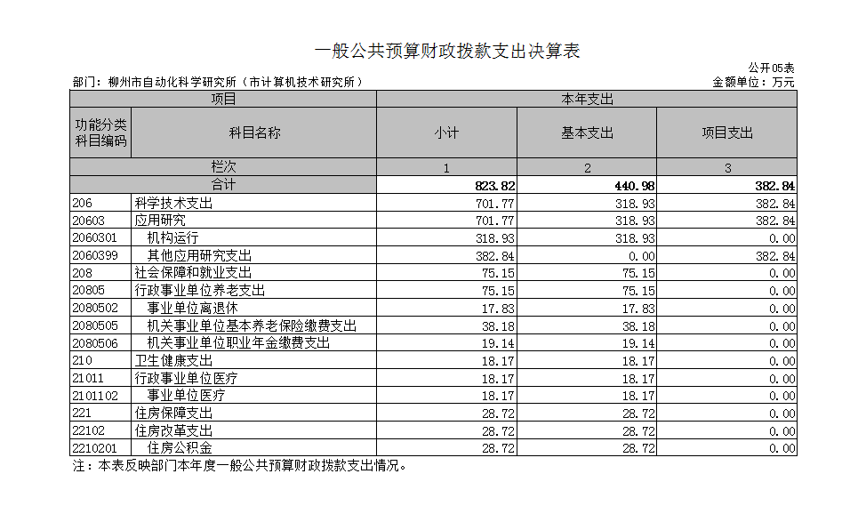 2020 年度财政拨款支出823.82万元,主要用于以下方面:科学技术(类) 支出701.77万元,占85.18%;社会保障和就业(类)支出75.15万元,占 9.12%;卫生健康(类)支出18.17 万元,占 2.21%; 住房保障(类)支出28.72万元,占3.49%。