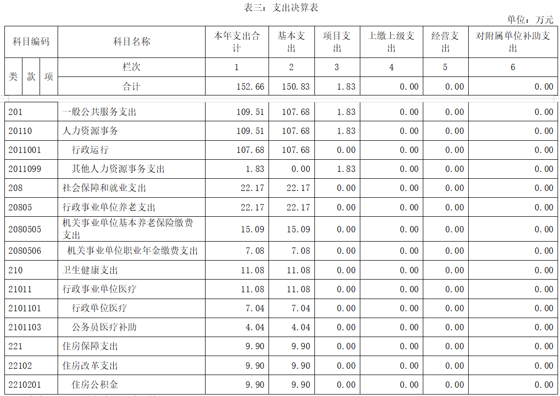 1.一般公共服务(类)人力资源事务(款)行政运行(项)。 年初预算为103.47万元,支出决算为107.68万元,完成年初预算的104.07%。决算数大于预算数的主要原因是发放年度绩效奖励金、年度考核优秀奖励金、增人增资等。