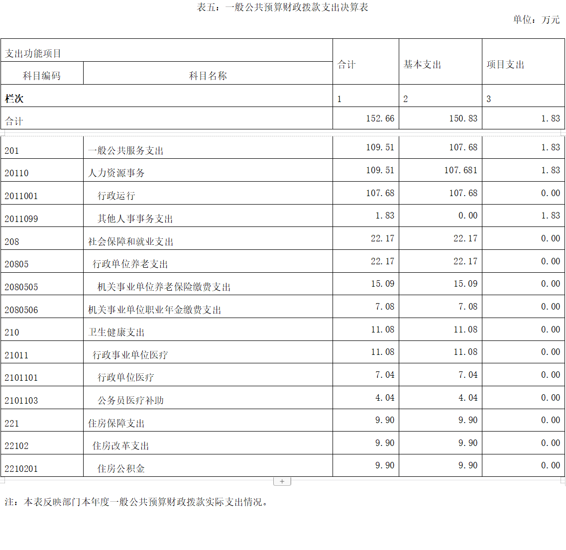 2020 年度财政拨款支出152.66万元,主要用于以下方面:一般公共服务(类)支出109.51万元,占71.73%;社会保障和就业(类)支出22.17万元,占14.52%;卫生健康(类)支出11.08万元,占7.26%; 住房保障(类)支出9.90万元,占6.48%。