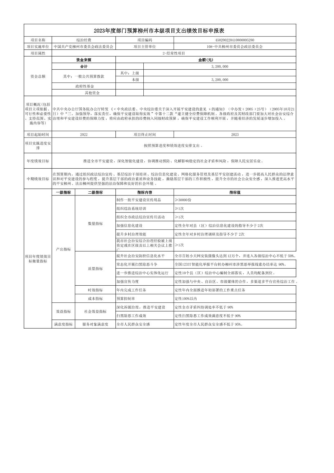 中共柳州市委政法委员会2023年综治经费项目支出绩效目标申报表.xls