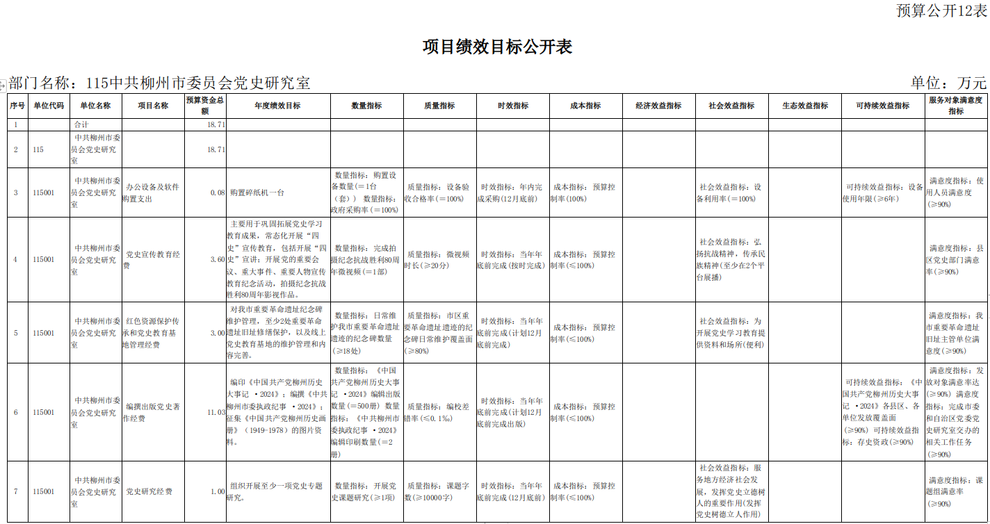 我部门2025年所有项目支出全面实施绩效目标管理,涉及柳 州市本级项目5个,预算资金18.71万元。绩效目标情况详见表12 (敏感涉密项目除外)。