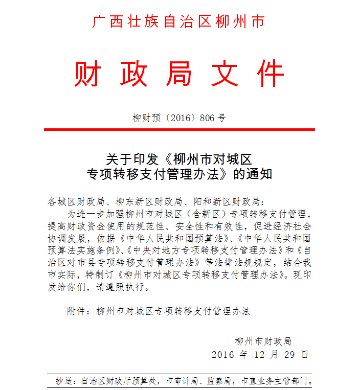 关于印发《柳州市对城区专项转移支付管理办法》的通知(柳财预〔2016〕806号)