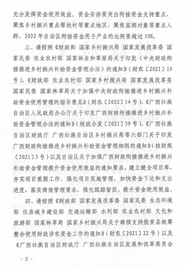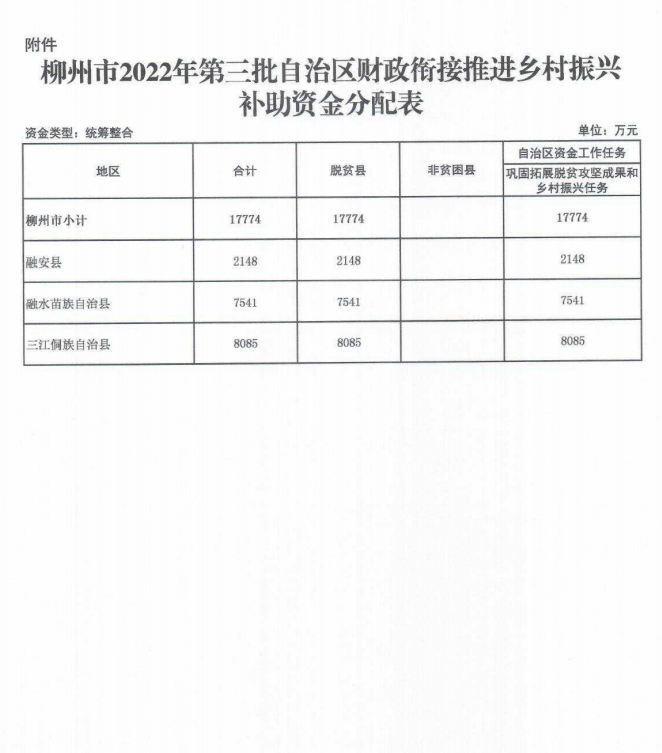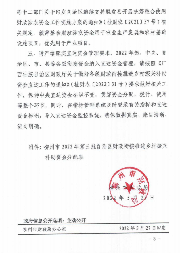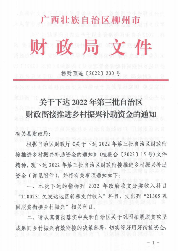 柳财预追[2022]230号关于下达2022年第三批自治区财政衔接推进乡村振兴补助资金的通知