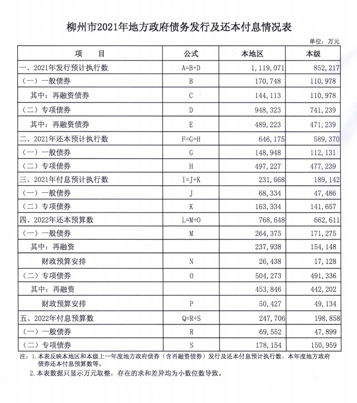 柳州市2021年地方政府债务发行及还本付息情况表