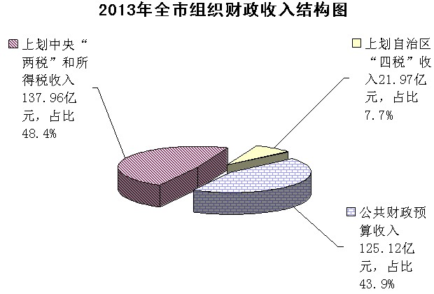 全市财政总收入的构成:(1)公共财政预算收入125.12亿元,增长10.2%;(2)自治区补助收入115.73亿元,下降8.6%,其中:返还性收入21.08亿元,增长1.5%;一般性转移支付收入49.65亿元,增长2.8%;专项转移支付收入45亿元,下降18.5%;(3)债券转贷收入5.88亿元;(4)上年结余收入(2012年结转到2013年的专款及结余收入)28.36亿元;(5)调入其他资金3.48亿元。