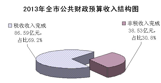 全市公共财政预算收入125.12亿元,增长10.2%,其中:税收收入完成86.59亿元,增长8%;非税收入完成38.53亿元,增长15.4%;非税收入占公共财政预算收入比重30.8%。