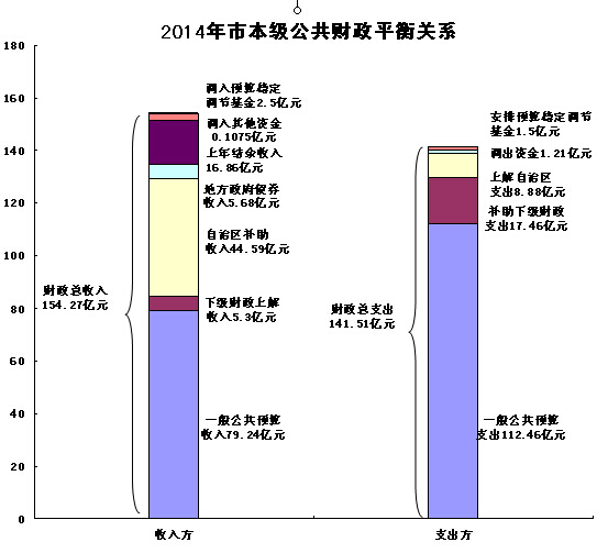 全市财政总收入的构成:(1)一般公共预算收入133.16亿元,增长6.4%;(2)自治区补助收入125.68亿元,增长4.2%,其中:返还性收入21.71亿元,增长3%;一般性转移支付收入52.82亿元,下降0.6%;专项转移支付收入51.15亿元,增长10.5%;(3)债券转贷收入6.57亿元;(4)上年结余收入(2013年结转到2014年的专款及结余收入)21.45亿元;(5)调入预算稳定调节基金3.38亿元,调入其他资金3406万元。