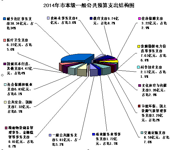 市本级一般公共预算支出112.46亿元,完成年度预算(以下简称预算)90.3%,增长11.4%。主要项目有:一般公共服务支出5.81亿元,完成预算93.3%;公共安全支出7.17亿元,完成预算96.8%;教育支出9.74亿元,完成预算95.2%;科学技术支出2.17亿元,完成预算99.8%;文化体育与传媒支出3.26亿元,完成预算86.1%;社会保障和就业支出6.83亿元,完成预算88%;医疗卫生与计生支出6.27亿元,完成预算89.8%;节能环保支出1.51亿元,完成预算45.6%;城乡社区支出38.34亿元,完成预算95%;农林水支出4亿元,完成预算89.3%;交通运输支出8.58亿元,完成预算91.3%;资源勘探信息等支出7.63亿元,完成预算91.4%;商业服务业等支出1.72亿元,完成预算73.2%;金融支出6160万元,完成预算99%;国土海洋气象等支出7789万元,完成预算65.1%;住房保障支出3.22亿元,完成预算82%;粮食物资储备支出1904万元,完成预算97.7%;国债还本付息支出4040万元,完成预算99.6%;其他支出4.07亿元,完成预算78.3%。