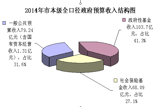 2014年,市本级全口径政府预算收入总计251.03亿元,其中:一般公共预算收入79.24亿元(含国有资本经营收入1.31亿元);政府性基金收入103.7亿元;社会保险基金收入68.09亿元。