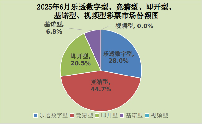6月份,乐透数字型彩票销售152.78亿元,同比增加1.51亿元,增长1.0%;竞猜型彩票销售243.23亿元,同比减少47.96亿元,下降16.5%;即开型彩票销售111.76亿元,同比增加33.04亿元,增长42.0%;基诺型彩票销售37.05亿元,同比减少1.15亿元,下降3.0%。6月份,乐透数字型、竞猜型、即开型、基诺型彩票销售量分别占彩票销售总量的28.0%、44.7%、20.5%、6.8%。视频型彩票销售0.0016亿元,同比增加0.0006亿元。