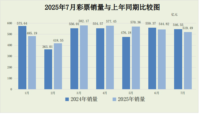7月份,全国共销售彩票519.49亿元[1],同比减少27.06亿元,下降5.0%,主要是受去年同期欧洲杯赛事影响,竞猜型彩票销量基数较高。其中,福利彩票机构销售179.28亿元,同比增加2.93亿元,增长1.7%;体育彩票机构销售340.22亿元,同比减少29.99亿元,下降8.1%。