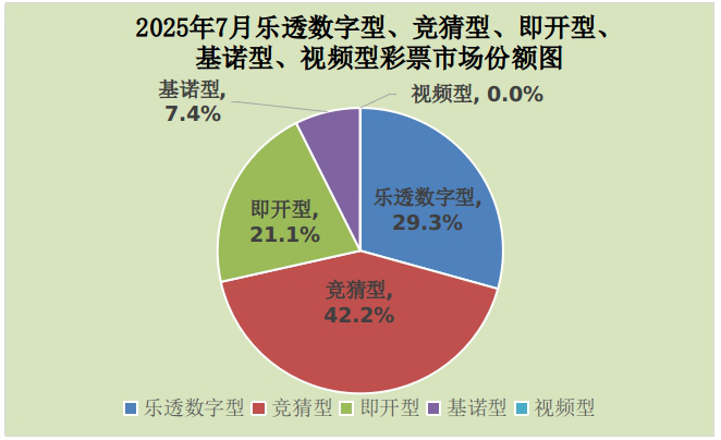 7月份,乐透数字型彩票销售151.96亿元,同比增加2.69亿元,增长1.8%;竞猜型彩票销售219.16亿元,同比减少62.55亿元,下降22.2%;即开型彩票销售109.69亿元,同比增加31.70亿元,增长40.7%;基诺型彩票销售38.68亿元,同比增加1.10亿元,增长2.9%。7月份,乐透数字型、竞猜型、即开型、基诺型彩票销售量分别占彩票销售总量的29.3%、42.2%、21.1%、7.4%。视频型彩票销售0.0023亿元,同比增加0.001亿元。