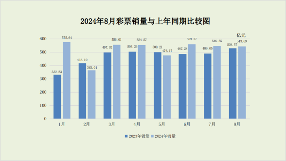 1-8月累计,全国共销售彩票4175.01亿元,同比增加417.41亿元,增长11.1%。其中,福利彩票机构销售1403.90亿元,同比增加140.65亿元,增长11.1%;体育彩票机构销售2771.11亿元,同比增加276.76亿元,增长11.1%。