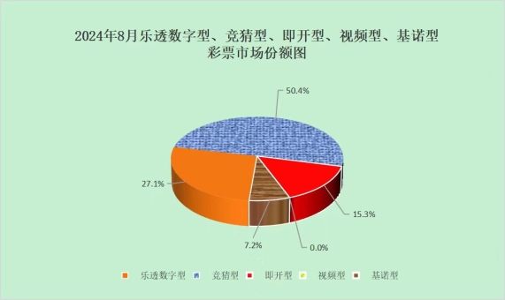 8月份,乐透数字型彩票销售147.62亿元,同比减少5.42亿元,下降3.5%;竞猜型彩票销售273.75亿元,同比增加52.22亿元,增长23.6%;即开型彩票销售82.95亿元,同比减少37.44亿元,下降31.1%;基诺型彩票销售39.37亿元,同比增加4.75亿元,增长13.7%。8月份,乐透数字型、竞猜型、即开型、基诺型彩票销售量分别占彩票销售总量的27.1%、50.4%、15.3%、7.2%。视频型彩票销售0.0011亿元,同比减少0.0006亿元。