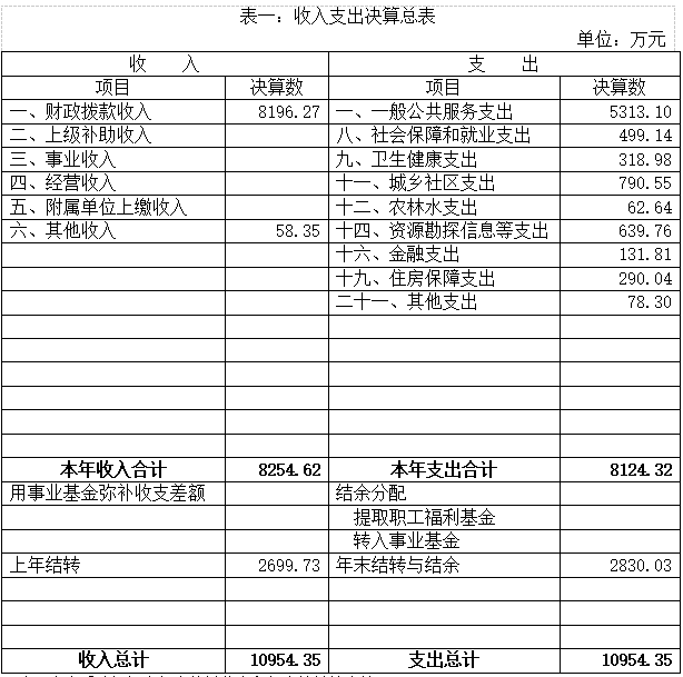 2019年度收入总计10954.35万元,支出总计10954.35万元,与2018年相比,收、支均增加753.16万元;均增长7.38%。