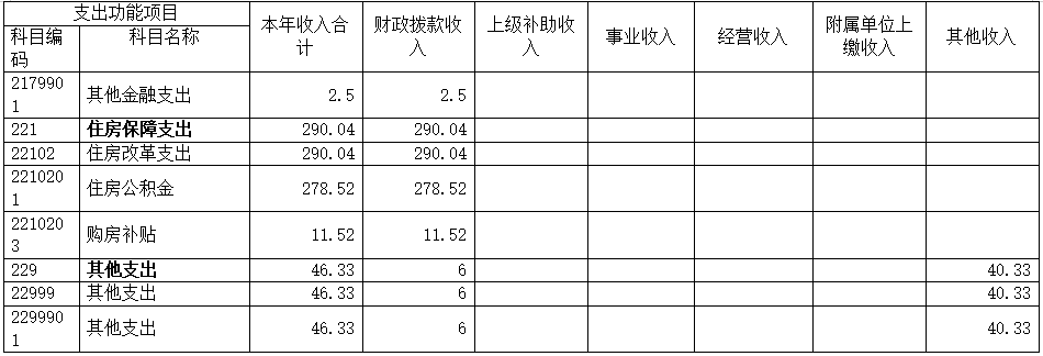 22.住房保障支出(类)住房改革支出(款)住房公积金(项),支出功能分类科目编码2210201。年初预算为271.32万元,支出决算为278.52万元,完成年初预算的102.65%。决算数大于预算数的主要原因是:部分支出按规定通过使用以前年度财政拨款结转结余资金解决。