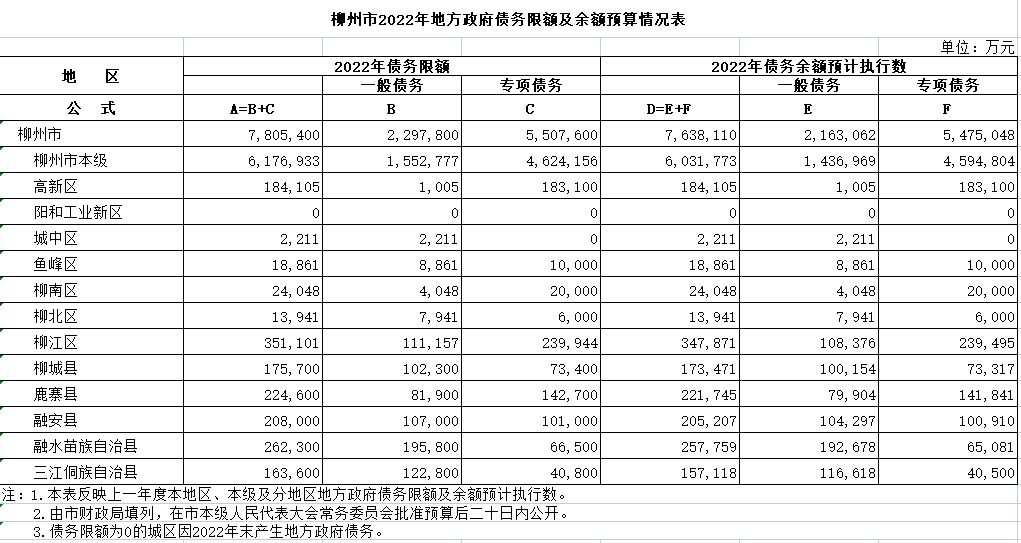 柳州市2022年地方政府债务限额及余额预算情况表.xlsx
