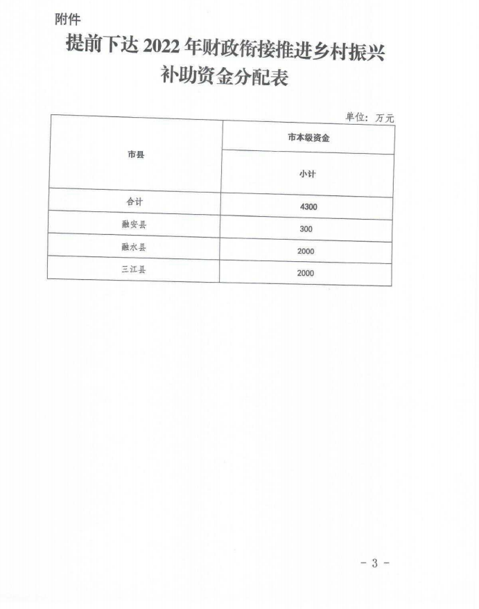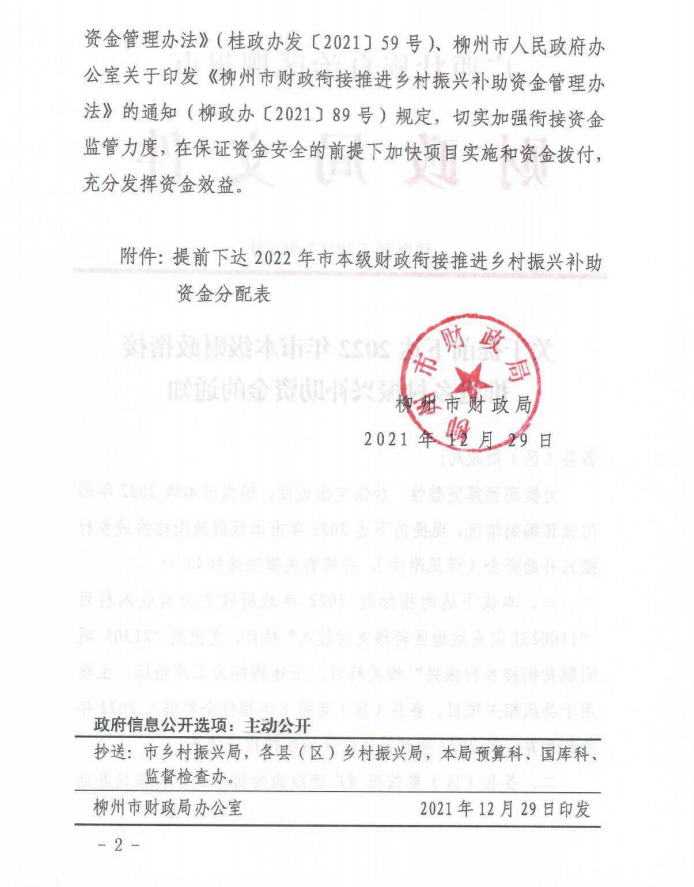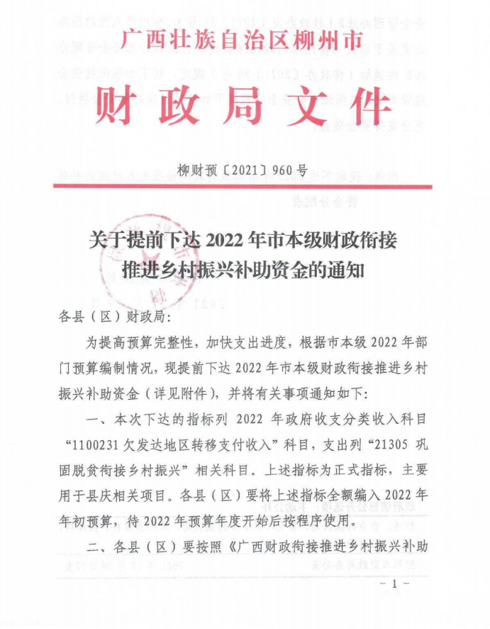柳财预〔2021〕960号 关于提前下达2022年市本级财政衔接推进乡村振兴补助资金的通知